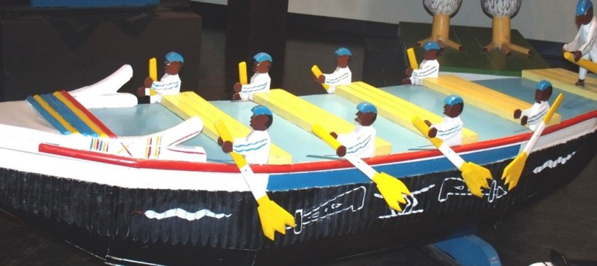 In the photograph shown we see what looks like a boat with rowers. The reality is it is a coffin, one of the many I saw in the National Museum of Funeral History, in Texas. Coffins of such a creative design are common in certain African cultures.